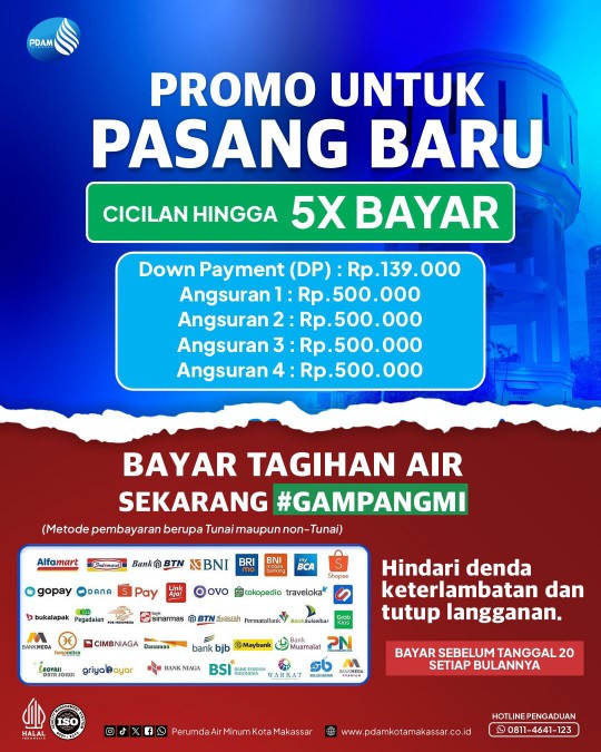 GADINGNEWS, MAKASSAR– Perusahaan Daerah Air Minum (PDAM) Kota Makassar kembali menghadirkan promo pemasangan sambungan baru air bersih yang sangat terjangkau. Melalui program ini, pelanggan baru dapat menikmati kemudahan pembayaran dengan sistem cicilan hingga 5 kali.