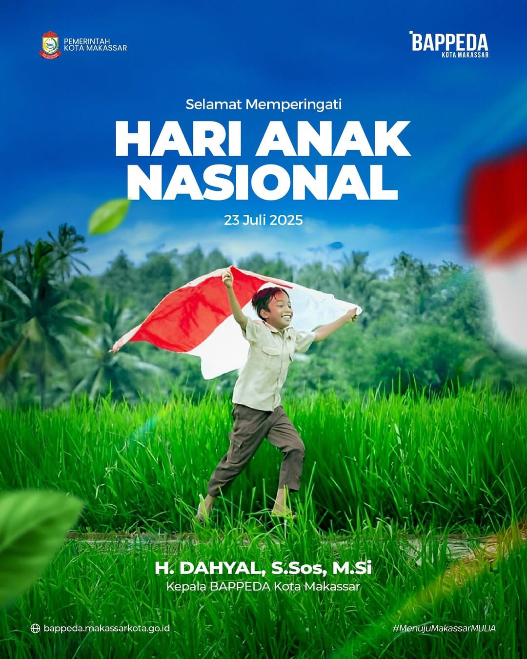 GADINGNEWS, MAKASSAR – Kepala Bappeda Kota Makassar Bapak H. Muh. Dahyal, S.Sos., M.Si mewakili seluruh jajarannya mengucapkan selamat memperingati Hari Anak Nasional (HAN) ke-41 tahun 2025.